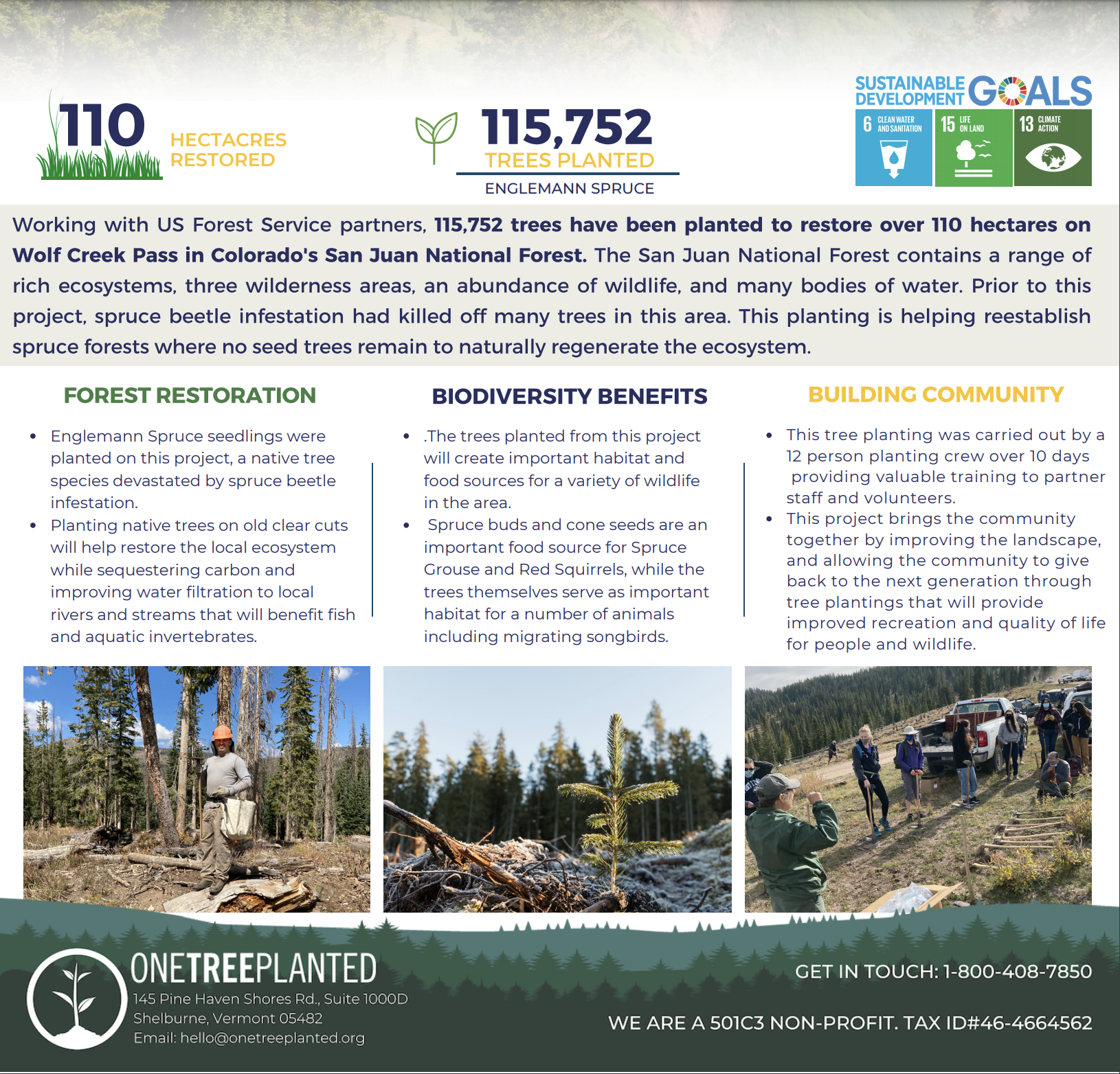 One Tree Planted has taken our monthly donation, along with many others to plant 115,752 Engelmann Spruce to restore over 110 hectares over Wolf Creek Pass. If you are interested in joining this movement please visit their website, link below